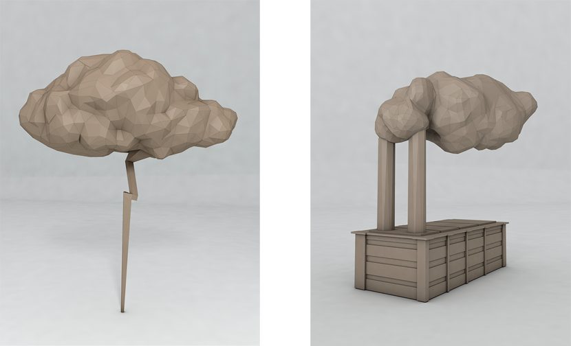 Tunderbolt | 2018 | Cardboard, transparent varnish, 52 x 140 x 117 cm Factory | 2018 | Cardboard, transparent varnish, 75 x 49 x 28 cm